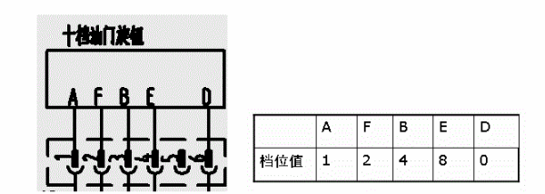 ①上图为十档油门旋钮的原理和各导线代表的数值,其中D(6脚)与车架地相连作为参考,当十档油门旋钮转动时,如果A(l脚)、F(2脚)、B(3脚)、E(4脚)与D(6脚)导通则显示上述档位值或相加所得档位值。如:F(2脚)、B(3脚)与D(6脚)导通则表示工作在6档。